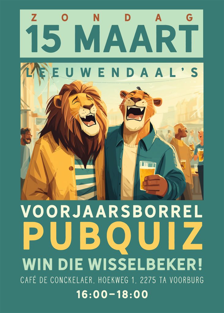 Voorjaarsborrel en Pubquiz 2026 Geplaatst op 9 maart 20269 maart 2026 door Leeuwendaal Zondag 15 maart. Voorjaars borrel en Pubquiz bij de Conckelaer. Win die wisselbeker!16:00-18:00